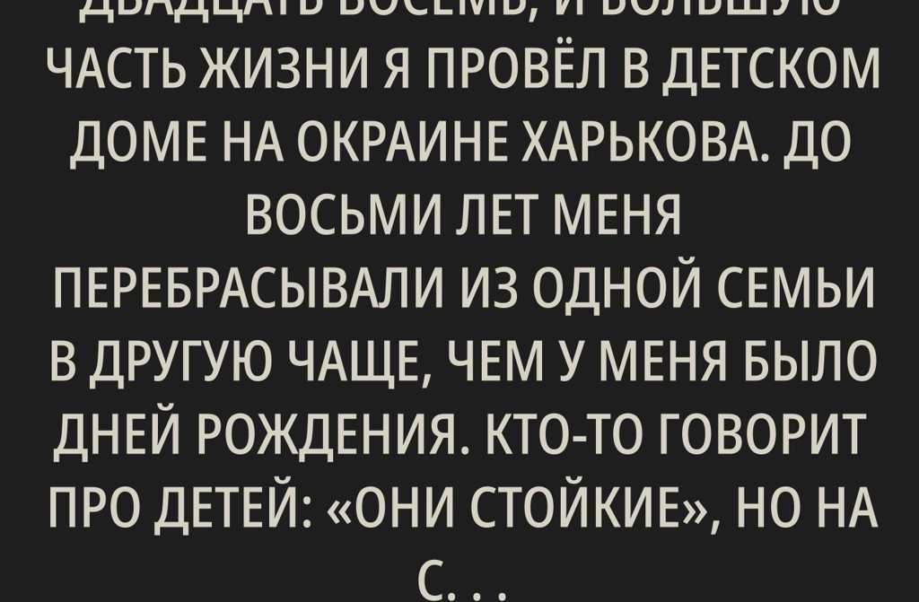 Сегодня мне исполнилось двадцать восемь, и большую часть жизни я провёл в детском доме на окраине Харькова. До восьми лет меня перебрасывали из одной семьи в другую чаще, чем у меня было дней рождения. Кто-то говорит про детей: «они стойкие», но на самом деле мы просто учимся быстро собирать свои вещи и не задавать лишних вопросов. Когда меня привезли в последний детдом, я дал себе одно обещание не привязываться ни к кому.