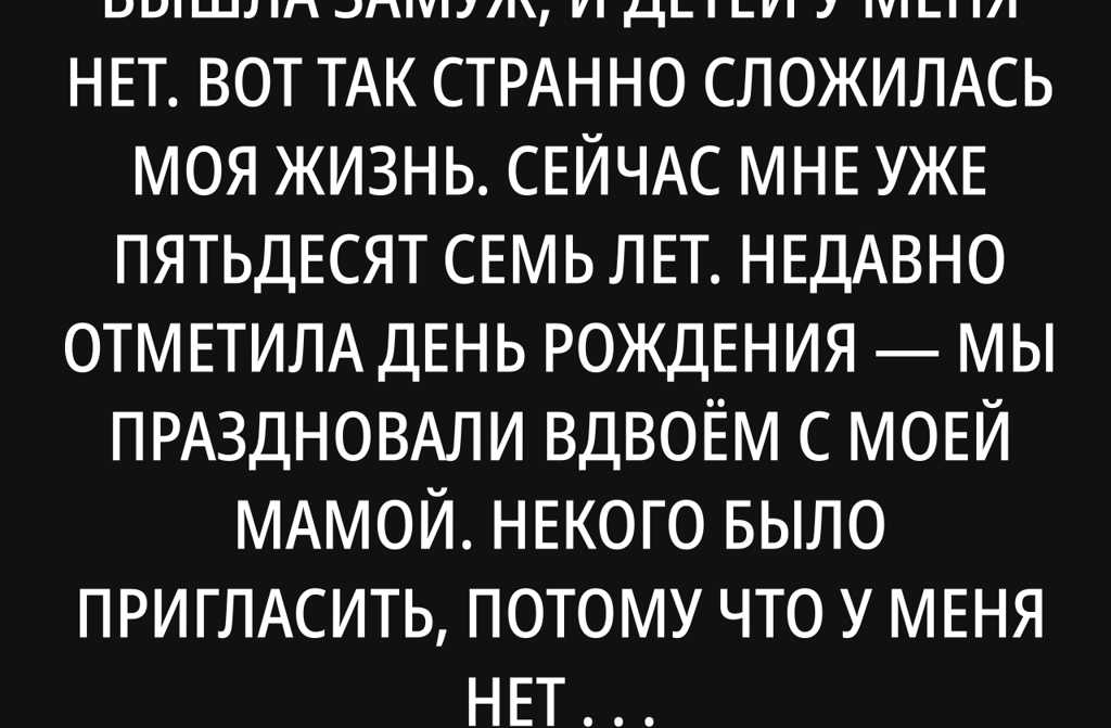 Так случилось, что я так и не вышла замуж, и детей у меня нет. Вот так странно сложилась моя жизнь. Сейчас мне уже пятьдесят семь лет. Недавно отметила день рождения мы праздновали вдвоём с моей мамой. Некого было пригласить, потому что у меня нет друзей, а у нас с мамой больше нет родственников.