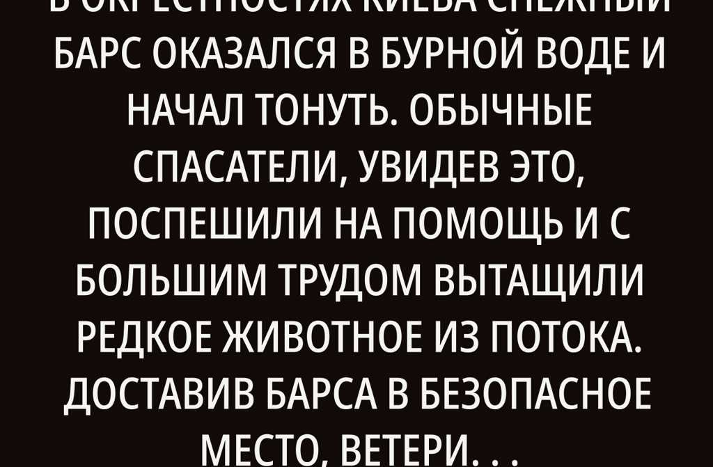 Во время сильного наводнения в окрестностях Киева снежный барс оказался в бурной воде и начал тонуть. Обычные спасатели, увидев это, поспешили на помощь и с большим трудом вытащили редкое животное из потока.