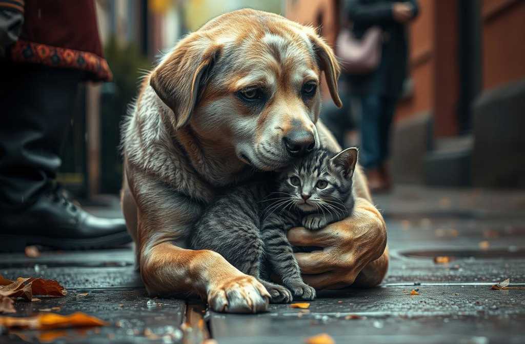 Иногда пёс, обняв лапами своего детёныша, прижимал его к себе, укрывая от холода и воды. Он дрожал, но облизывал котёнка. А ведь главное было согреть и накормить его.