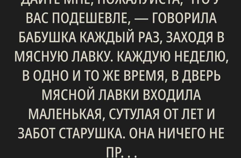 На следующий день бабушка пришла снова. Остановилась у витрины. Достала портмоне. Посмотрела в него тем же тяжелым взглядом. Мясник присмотрелся: потрескавшиеся руки, коротко остриженные ногти, старое пальто. Глаза, которые уже ничего не просят от жизни лишь держатся.