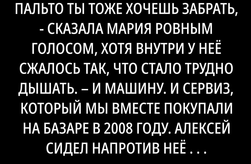 — Значит, пальто ты тоже хочешь забрать, — сказала Мария ровным голосом, хотя внутри у неё сжалось так, что стало трудно дышать. И машину. И сервиз, который мы вместе покупали на базаре в 2008 году.