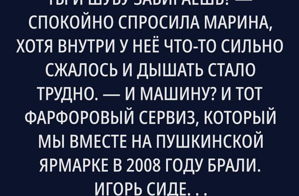 Значит, ты и шубу забираешь? спокойно спросила Марина, хотя внутри у неё что-то сильно сжалось и дышать стало трудно. И машину? И тот фарфоровый сервиз, который мы вместе на Пушкинской ярмарке в 2008 году брали.