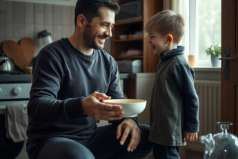 Он чтото делает у плиты, она быстро умывается и идёт на кухню.
