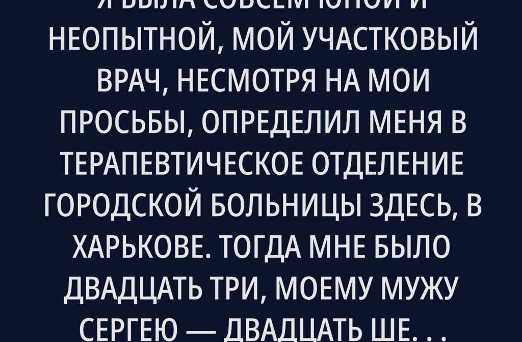 Двадцать пять лет назад, когда я была совсем юной и неопытной, мой участковый врач, несмотря на мои просьбы, определил меня в терапевтическое отделение городской больницы здесь, в Харькове. Тогда мне было двадцать три, моему мужу Сергею двадцать шесть. Серёжа трудился инженером в научно-исследовательском институте, я была на последних курсах университета. В браке наш счет шел только на второй год, детей завести не поспели нам казалось, что ещё все впереди, а распашонки и пеленки были делом отдалённого будущего.